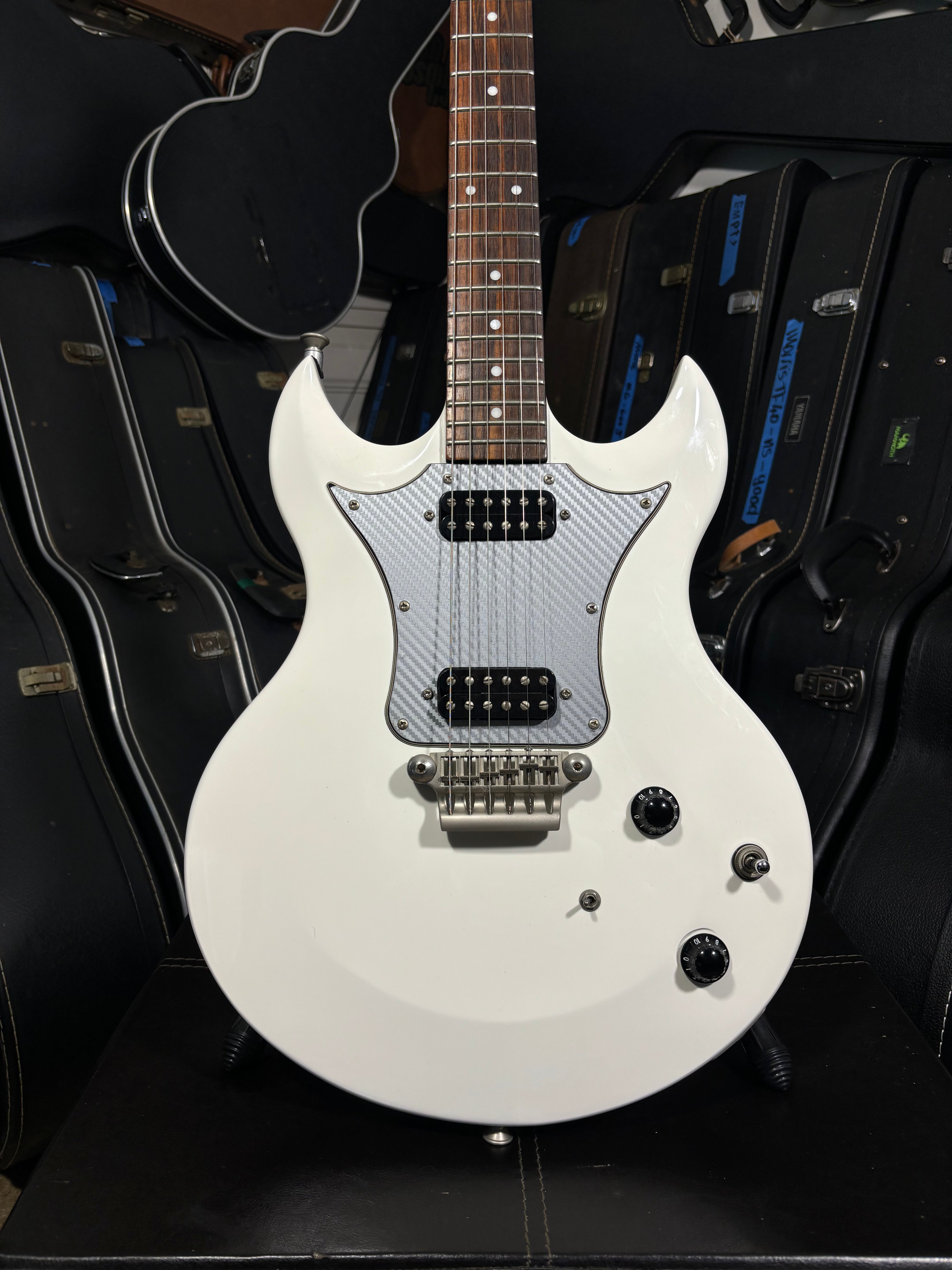 The carbon-fibre 5-ply pickguard looks stunning against the white finish, adding a modern touch to a classic design. Perfect for players who want versatility, style, and reliability.